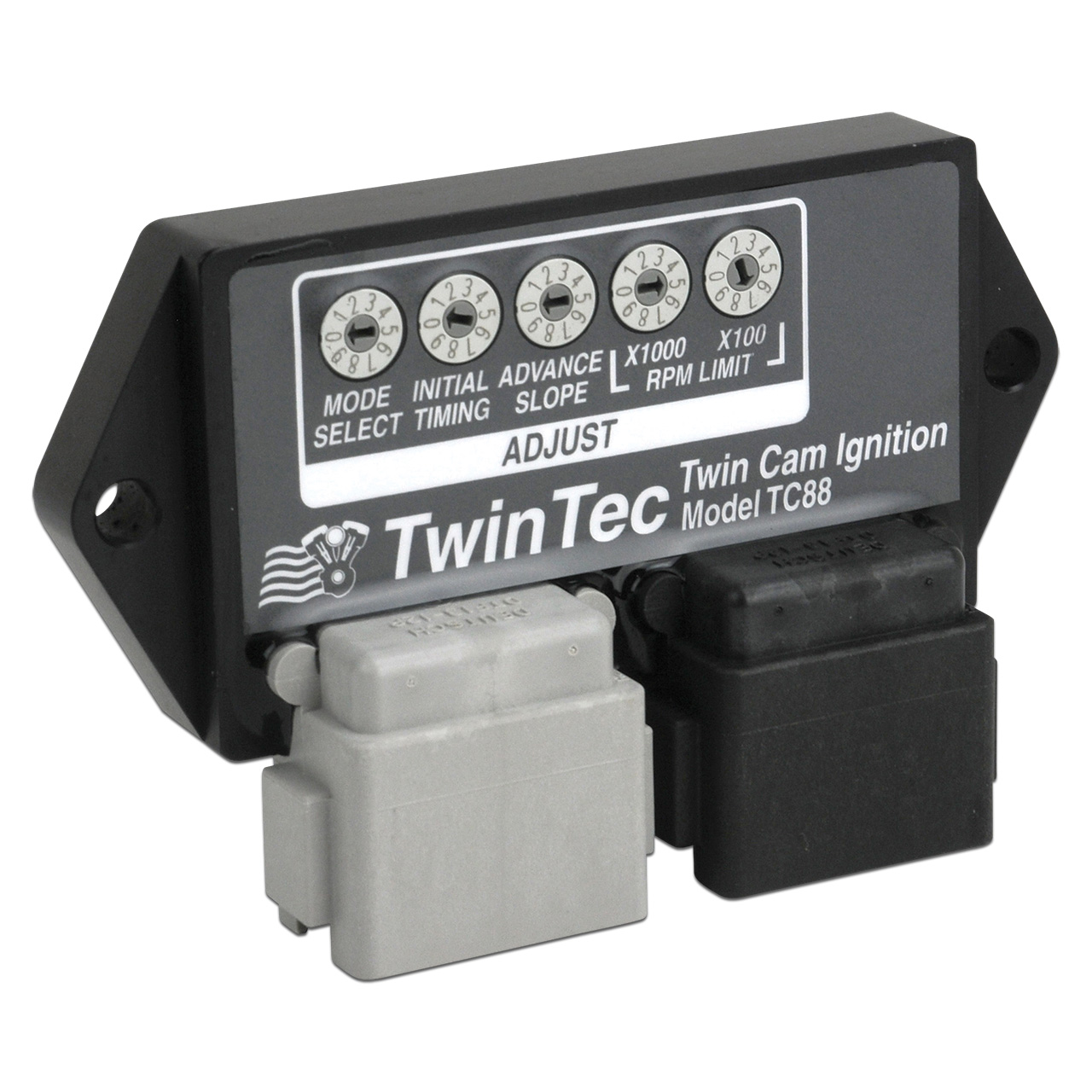 Twin Cam engine utilize a non-adjustable crankshaft position sensor, this means that mechanical timing adjustments are no longer possible. The 1008/TC88 allows you to adjust your initial timing +-4 degree using a rotary switch. A second switch sets the advance curve slope. The combination of these two switches allows the user to optimize the timing advance for a wide range of applications – from stock to highly modified engines. For details, including advance curves, please download you can download the installation instructions from our website.